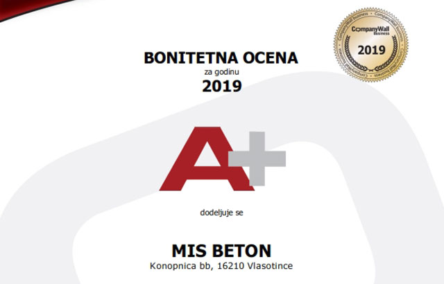 Mis beton dobio sertifikat bonitetne izvrsnosti