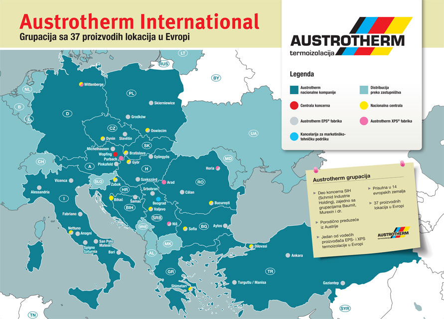 Austrotherm d.o.o. danas na četiri lokacije u Srbiji (Valjevo, Srbobran, Niš i Beograd) stalno zapošljava oko 150 ljudi. Prodajnu mrežu preduzeća čini preko 200 partnera (distributera, trgovaca građevinskih materijala u veleprodaji i maloprodaji) raspoređenih po celoj zemlji, ali i u susednim državama Crnoj Gori i Severnoj Makedoniji, za koje srpski Austrotherm d.o.o. sve vreme ima nadležnost. Strukture u branši sa kojima Austrotherm d.o.o. aktivno i uspešno sarađuje nisu samo trgovci, već i inženjeri/projektanti, izvođači građevinbskih radova kao i građevinski investitori. Pomenutim strukturama se nude pre svega usluge konsaltinga, odnosno tehničkog savetovanja kada je u pitanju pravilna primena i ugradnja svih proizvoda robne marke "Austrotherm".