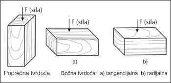 | Slika 1. Tvrdoća drveta može biti određena paralelno sa vlakancima - poprečna tvrdoća ili upravno na vlakanca - bočna tvrdoća. |