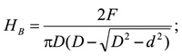 Gde je: HB - tvrdoća po Brinelu, izražena u N/mm2 ili MPa, F – sila od 1000 N, D - prečnik kuglice - 10 mm, d - prečnik otiska (poprečna tvrdoća) ili srednji prečnik ako je bočna tvrdoća u pitanju d = (d1+d2)/2 u mm.
