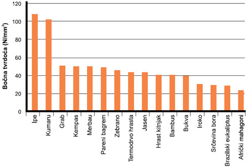 Grafikon: Bočne tvrdoće nekih domaćih i stranih vrsta drveća |