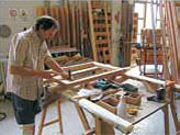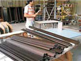 | 24. OKIVANJE Posle sušenja koje traje najmanje 24 sata, pristupa se okivanju krila i štokova. Ova operacija se izvodi na automatskoj kompjuterizovanoj mašini koja nakon unošenja dimenzija krila, odnosno elemenata štoka, automatski proračunava tačke bušenja i frezovanja za montažu okova. Kao rezultat dobija se konstantno visoka preciznost okivenog elementa. |