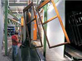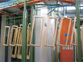 | 19. FARBANJE Ova operacija počinje kačenjem ramova o kuke pogonjenog transportera i to na način da zauzimaju blago naget položaj, kako bi se omogućilo nesmetano okapljavanje viška boje. |