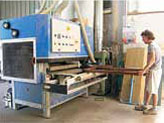 | 13. BRUŠENJE Posle sušenja površina tretiranih gitom sledi brušenje krila, koje se vrši na šitokotračnoj protočnoj brusilici – kalibrirki koju sačinjavaju tri radna valjka. Trake su različitog granuliteteta, a brušenje se izvodi u jednom prolazu. Najfinija traka se koristi za brušenje lakiranih površina. Zajedno sa krilima vrši se i brušenje elemenata štoka. Brušenje profila obavlja se sa specijalnom tračnom brusilicom. Mašina može da bude jednostrana ili dvostrana, kao i sa većim brojem radnih grupa. |