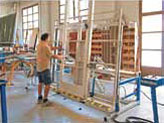 | 9. LEPLJENJE Sledeća operacija predviđa slepljivanje gotovih elemenata, odnosno formiranje ramova – krila prozora. Operacija se izvodi na takozvanoj ram presi. Zahvaljujući hidro-klipovima formiraju se ramovi tačnih dimenzija i oblika. Lepkovi koji se koriste su u klasi B3 i B4. |