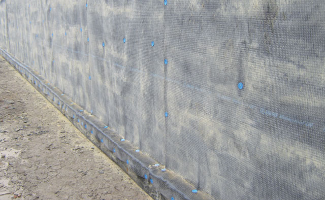 Sve vertikalne površine iznad kote terena koje je potrebno zaštititi od vode, a dolaze u kontakt sa bentonitnom tkaninom, hidroizolujemo dvokomponentnom polimer-cementnom masom MAPELASTIC FOUNDATION u kombinaciji sa hidroekspanzivnom bentonitnom pastom MAPEPROOF MASTIC. MAPELASTIC FOUNDATION je visokoelastična polimer-cementna masa za hidroizolaciju betonskih površina od pozitivnog i negativnog pritiska vode iz tla. Nanosimo ga valjkom ili četkom u dva sloja ukupne debljine 2mm, na očvrsle betonske površine prethodno natopljene vodom.