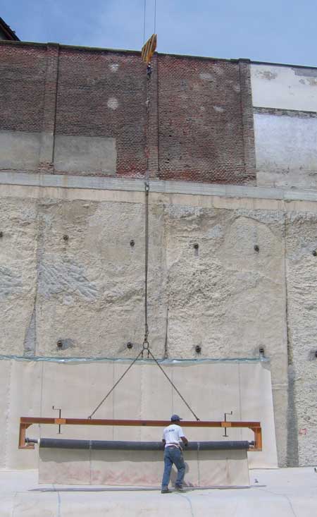 Kada po obodu objekta postoje potporne konstrukcije u vidu dijafragmi, prvi korak je pranje i čišćenje površina pod visokim pritiskom, kako bi se podloga očistila od svih nečistoća i uklonili svi nevezani delovi. Ukoliko postoje zatege, one se moraju prethodno obraditi - reprofilisati primenom sulfatnootpornog, tiksotropnog maltera ojačanog vlaknima MAPEGROUT T60, uz dodatak 0,25 % aditiva MAPECURE SRA. Nakon očvršćavanja maltera, na glavama zatega se moraju ugraditi manžete od bentonitne tkanine, čime obezbeđujemo kontinuitet hidroizolacije.