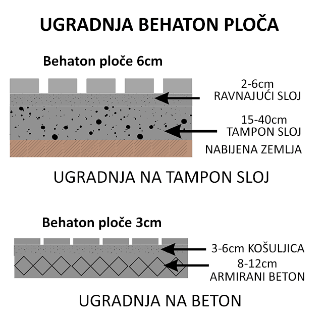 Da bi poplačana površina bila kvalitetno izvedena, neophodna je dobra i kvalitetna podloga ispod nje. Iz tog razloga su pravilno dimenzionisani i ugrađeni tampon slojevi podjednako važni koliko i izbor vrste behaton ploča i sama ugradnja istih.