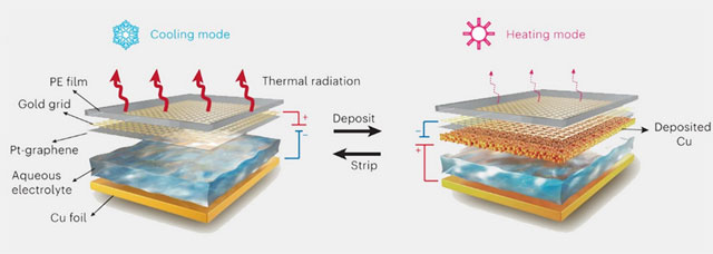 Hemijskom reakcijom centralni sloj materijala - rastvor elektrolita na bazi vode - transformiše se u čvrsti bakar. Bakar sa niskim emisijama pomaže da se zadrži toplota i zagreje unutrašnjost zgrade, dok vodeni sloj visoke emisije održava zgradu hladnom.