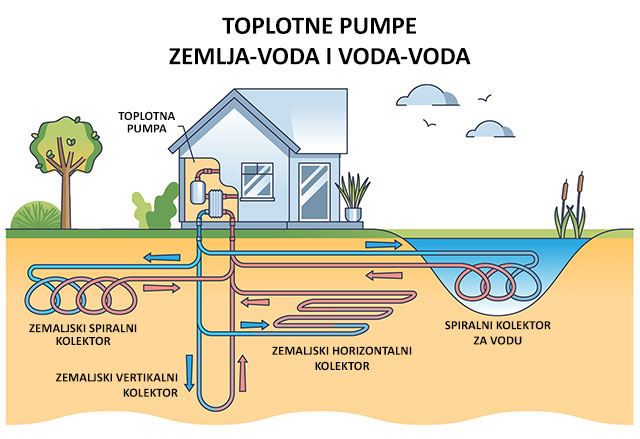 - Zemlja-voda i geotremalne toplotne pumpe, koje uzimaju energiju iz zemlje polaganjem sondi;