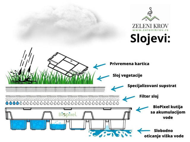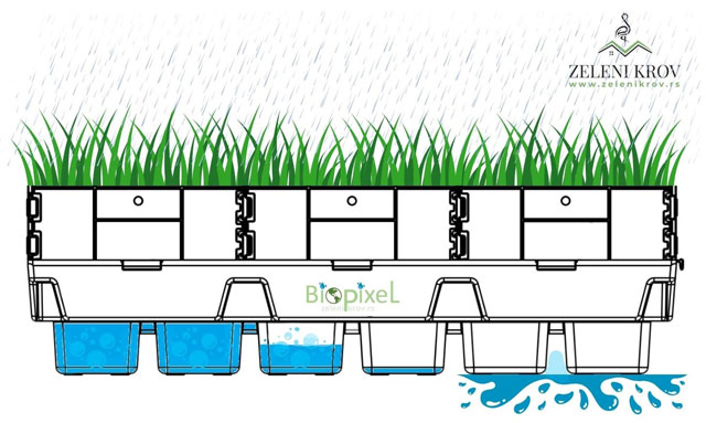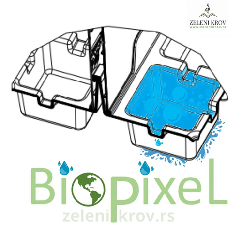 Bio Piksel je plastična kutija sa integrisanim elementima drenaže, akumulacije i filtracije vode. Obod kutije omogućava formiranje biljnog pokrivača još u rasadniku uz mogućnost lakog prenošenja i brze montaže na krovu.