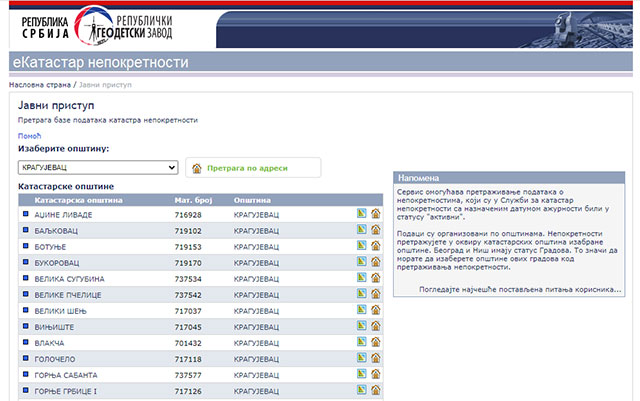 eKatastar nepokretnosti je jedinstveni centralni registar u kome se nalaze svi podaci o upisanim nepokretnostima na teritoriji cele države, podeljeni po opštinama. Među opštinama nalaze se i gradske opštine Beograda i Niša. Prilikom pretrage nekretnine koja se nalazi na teritoriji ovih opština, važno je znati da se za pretragu bira opština određenog grada gde se nekretnina nalazi. Pa tako, ako se nekretnina nalazi na Voždovcu, u pretragu birate katastarska opština Voždovac, a ne Beograd.