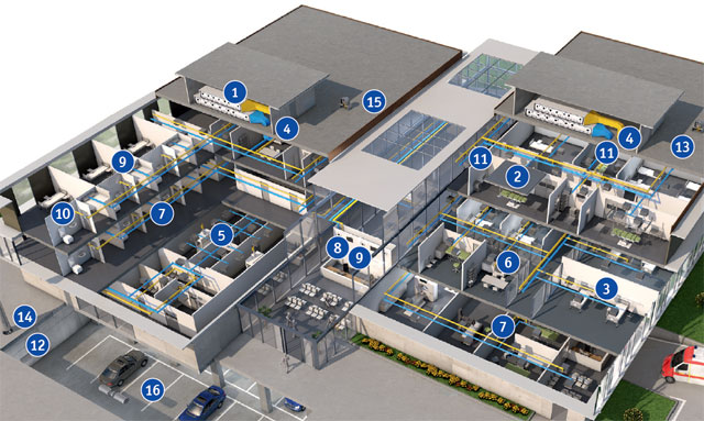 Higijenski besprekoran vazduh u dovoljnoj količini predstavlja osnov za brz oporavak. Zbog toga kvalitatan sistem za ventilaciju i klimatizaciju predstavlja značajnu prednost među bolnicama, jer se njime obezbeđuje visok stepen zadovoljstva pacijenata. Inovativni elementi za distribuciju vazduha sa podesivim usmerivačima obezbeđuju efikasno smanjenje brzine vazduha, a time i vazduh sa slabim turbulencijama čime se pospešuje osećaj ugodnosti kod pacijenata.
