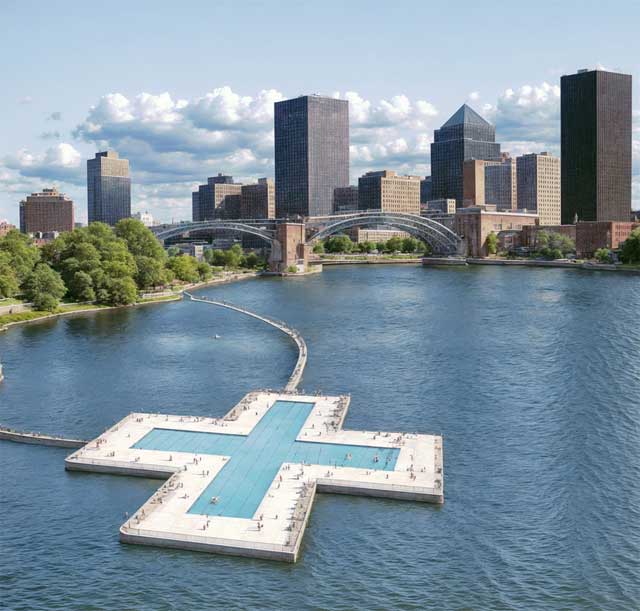 Projekat "+Pool" dobio je značajnu finansijsku podršku od 4 miliona dolara od Grada Njujorka i dodatnih 12 miliona dolara od države Njujork. Dizajniran od strane studija PlayLab Inc iz Los Anđelesa i sada rasformiranog studija Family, ovaj bazen u obliku krsta ima za cilj da filtrira rečnu vodu bez upotrebe hemikalija, pružajući javno dostupno kupalište za stanovnike Njujorka.