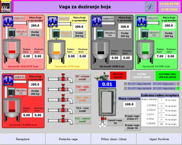 Prikazani softver upravlja automatikom mešanja i doziranja 5 različitih tečnih pigmenata. Trenutno postoje rešenja za maksimalno 8 tečnih pigmenata ili 4 tečna pigmenta na 2 betonjerke i 1 vagi.