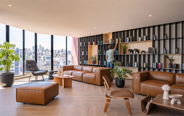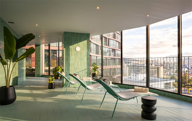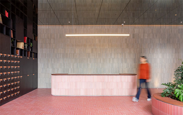 Unutar zgrade, predvorje je obloženo pločicama, sa prijemnim pultom mat roze boje i sivim zidom koji se uzdiže ka reflektujućem crnom plafonu. U zajedničkim prostorijama za dnevni boravak dominira drveni pod i beli plafoni, dok su stambene jedinice zadržale određenu dozu tajanstvenosti, budući da tim nije objavio njihove slike.