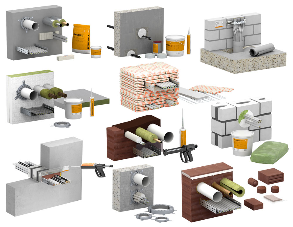 Izbor odgovarajućeg izolacionog sistema zavisi od različitih parametara. Opcije primene se kreću od čvrstih zidova i plafona, do pregradnih zidova. Instalacije koje mogu da prolaze mogu biti kablovi i nosači kablova, zapaljive i nezapaljive cevi ili kombinacije.
