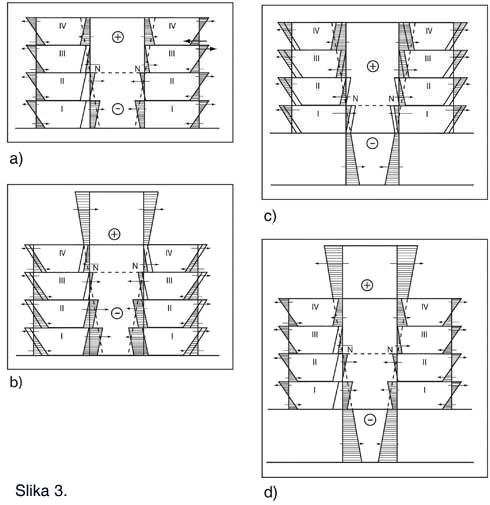 Na slici 3a šematski su prikazani preseci kroz višespratnu atrijumsku zgradu sa uticajem temperature (efekat dimnjaka) na raspodelu pritisaka u periodu dogrevanja zimi, kao i hlađenja u toku letnje noći.