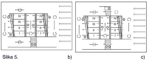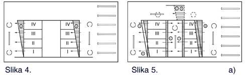 Na obodnim zidovima objekta se uspostavlja raspodela pritiska i cirkulacija vazduha identična prethodnom slučaju 4b, tj. na otvorenoj strani dolazi do uravnoteženaj pritiska – ustrujavanja i istrujavanja, a na zaklonjenoj do pojave intezivnog negatovnog pritiska i domninantnog istrujavanja. (28)