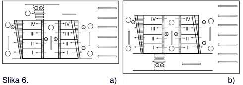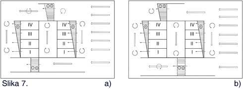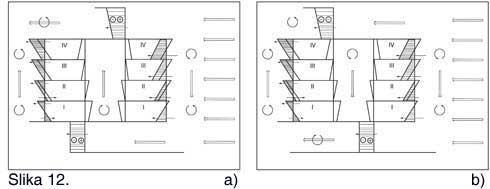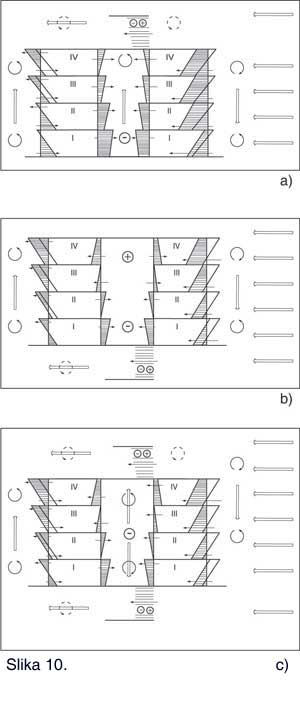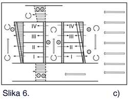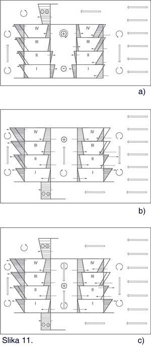 Na obodnim zidovima objekta uspostavlja se raspodela pritisaka i cirkulacija vazduha identična slučaju 10a, tj. na otvorenoj strani dolazi do pojave intenzivnog pozitivnog pritiska i dominantnog ustrujavanja vazduha, a na zaklonjenoj do uravnoteženja pritiska, tj. ustrujavanja i istrujavanja. (25)