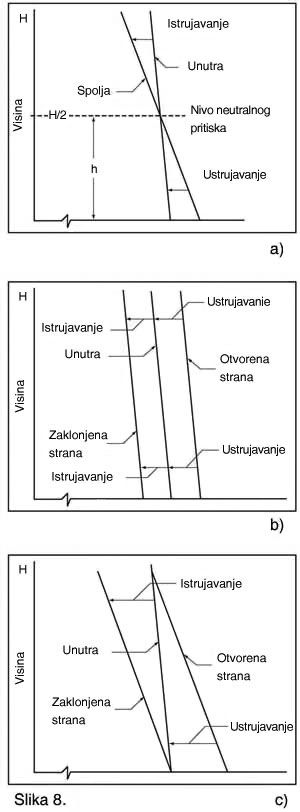 Na obodnim zidovima objekta dolazi do korigovanja razlike pritiska, tj. na otvorenoj strani do ursvnoteženja pritiska – ustrujavanja i istrujavanja, a na zaklonjenoj do pojave intezivnog negativnog pritiska i dominantnog istrujavanja (27)
