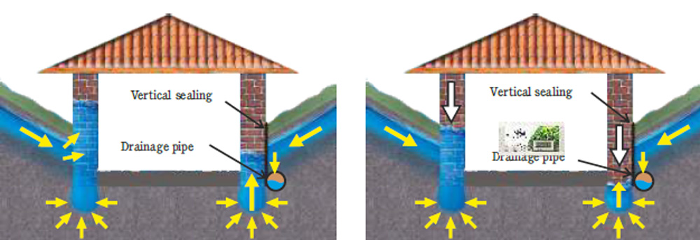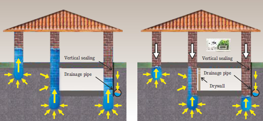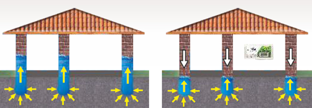 - Uređaj u svom dometu (radijusu) vraća vlagu iz svih zidova natrag u zemlju (kako iz spoljašnjih, tako i iz pregradnih zidova) te ih štiti od ponovnog podizanja kapilarne vlage.