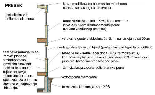 Tako pod prizemlja u delu kuće nije betonska ploča već grede međuspratne konstrukcije (pod modula) ispod kojih ima još oko metar do „mrtve“ ploče (ploča koja leži na zemlji). Ovaj prostor ispod kuće, koji se kod nas najčešće zatrpava zemljom iz iskopanih temelja, ključan je za izuzetnu energetsku efikasnost kuće i visoki kvalitet unutrašnjeg vazduha i komfora.