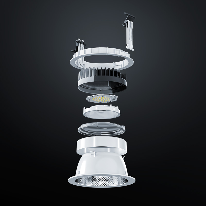 Dodatne prednosti potpuno redizajnirane porodice svetiljki uključuju proverenu tehnologiju reflektora, koja obezbeđuje optimalno usmeravanje snopa svetlosti, optimalnu kontrolu odsjaja (UGR 19) za maksimalni vizuelni komfor i visoku svetlosnu efikasnost do 159lm/W, što smanjuje energetske zahteve i troškove.