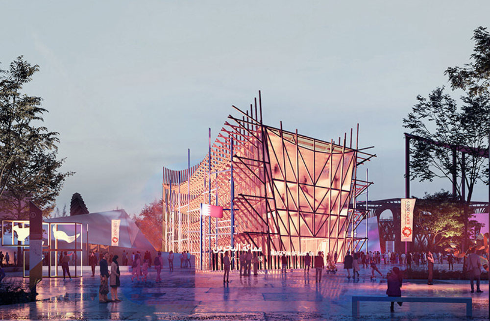 Bahreinski paviljon, delo arhitektkinje Line Gotmeh, evocira izgled tradicionalnih brodova korišćenih u Persijskom zalivu. Okrenut prema moru, objekat simbolizuje pomorsku istoriju Bahreina, dok enterijer otkriva veštine ručne izrade i prirodne resurse koji su obeležili identitet zemlje.