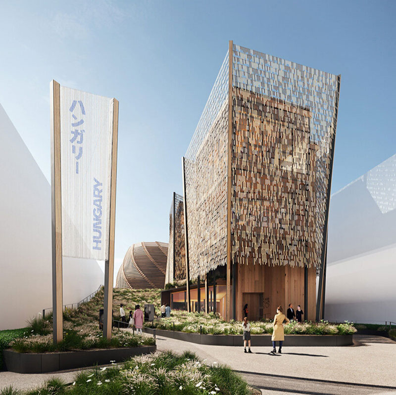 Mađarska se odlučila za arhitektonski koncept koji rezonuje sa Fujimotovim kružnim masterplanom - paviljon koji evocira izgled šume i koristi prirodne materijale. Drvene ploče i tradicionalne tehnike, zajedničke mađarskoj i japanskoj arhitekturi, dominiraju konstrukcijom.