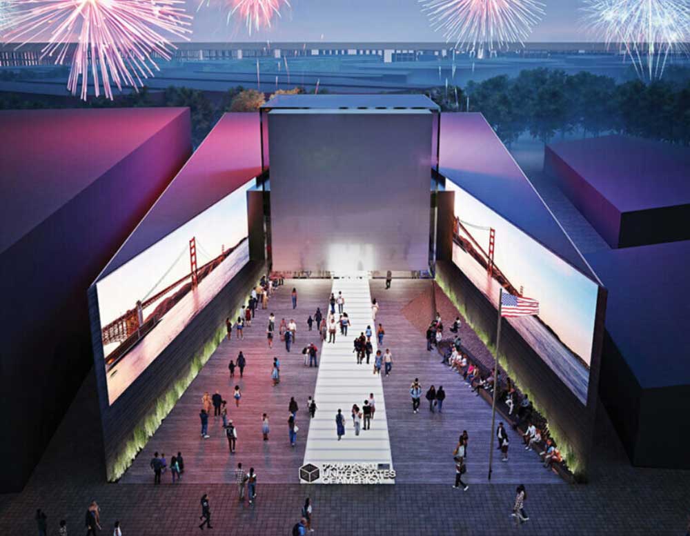 Paviljon Sjedinjenih Američkih Država, koji potpisuje arhitektonski studio Trahan Architects u saradnji sa kompanijom ES GLOBAL, sastoji se od dve zakrivljene forme koje uokviruju centralni trg sa panoramskim LED ekranima.