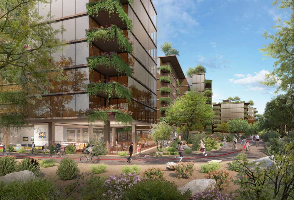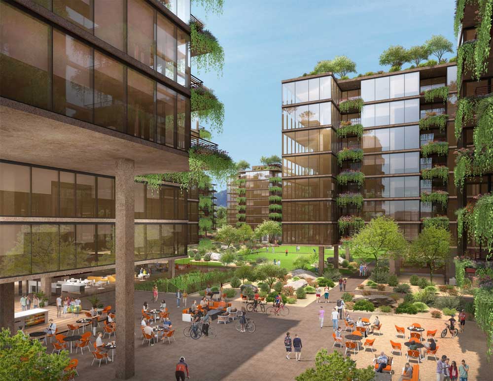 Kompleks će se sastojati od šest osmospratnica, raspoređenih oko deset hektara velikog zelenog dvorišta. Vizualizacije prikazuju objekte sa fasadama od stakla u braon nijansi, dok bujno rastinje visi sa terasa. Arhitektonska forma objekata je uglavnom pravougaona, ali su delovi izbačeni ka unutrašnjem dvorištu, stvarajući manje, intimnije trgove unutar većeg prostora.