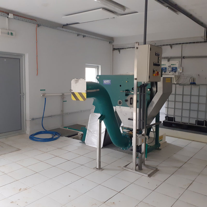 Kako je pad vode gravitacioni i nema potrebe za izgradnjom dodatne pumpne stanice, ulaz u postrojenje je gruba ručna rešetka u širokom kanalu pod nagibom. Odmah iza nje nalazi se fina rešetka sa dehidraciojm influenta i presom za potiskivanje čvrste frakcije i izbacivanje napolje u vidu bale.