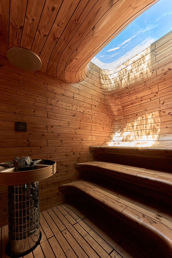 U podzemnom nivou vile nalazi se sauna u koju sunčevi zraci dopiru kroz bazen iznad stvarajući ambijent nalik pećini, evocirajući osećaj boravka pod vodom.