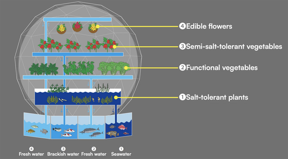 Ono što ovu kupolu čini revolucionarnom jeste njen unutrašnji sistem, zasnovan na spoju akvaponike i hidroponije. Umesto tradicionalnog horizontalnog rasporeda spratova, prostor je organizovan kao vertikalni ekološki presek sa četiri sloja biljaka koje rastu iznad četiri rezervoara sa različitim stepenima saliniteta - od morske vode, preko bočate, do slatke.