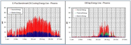 Simulacija godišnje potrošnje energije DEVap-a (uz korišćenje prirodnog gasa kao izvora toplote) - Zbog principa na kom radi, DEVap je podesan za suve klime gde isparavanjem i isušivanjem vazduha mogu da se postignu smanjenja temperature. |