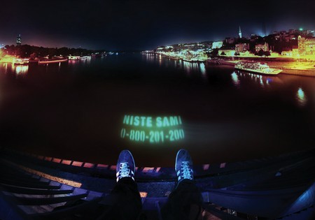 Niste sami Samo dva meseca pošto je portal Gradjevinarstvo.rs objavio ovaj tekst, čak i svetski mediji objavili su fotografiju iznad i zanimljivu priču iz Begrada: "U cilju prevencije samoubistava skokom s mosta, ispod Brankovog mosta u Beogradu postavljen projektor koji prikazuje poruku "Niste sami" i broj telefona kancelarije za prevenciju samoubistva. Više od 1.500 ljudi godišnje u Srbiji izvrši samoubistvo. Od tog broja, njih 40 uskrati sebi život skokom sa beogradskih mostova. Vođena ovim podatkom, gradska vlast Beograda, u saradnji sa marketiškom agencijom "Meken Erikson", instalirala je projektor ispod Brankovog mosta koji prikazuje poruku "Niste sami". Sa mosta je projektovana poruka sa brojem telefona kancelarije za prevenciju samoubistva. Projektovana poruka i broj telefona se mogu videti samo kada se gleda sa mosta na dole." izvor: RTS |