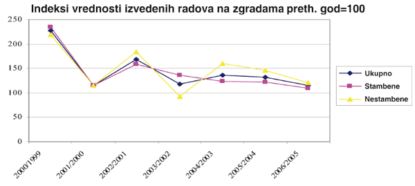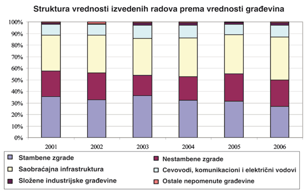 Radi ilustracije rezultata statistike građevinarstva tabelarno je dat kratak prikaz nekih njenih podataka za period od 2001. do 2006. godine. Izvedeni radovi na građevinama prikazani su prema teritoriji na kojoj se građevine nalaze, a ne prema teritoriji sedišta izvođača radova. Iskazani su zajedno izvedeni radovi građevinskih i građevinsko-zanatskih preduzeća, radovi negrađevinskih preduzeća u svim sektorima svojine, kao i radovi na zgradama izvođeni u organizaciji individualnih vlasnika. Rezultati su razvrstani prema Klasifikaciji vrsta građevina (edicija RZSS Metodologije i standardi, sveska br. 15, Beograd, 2005) koja važi od 2003. (usklađivanje podataka iz prethodnih godina urađeno je prema njoj). Obuhvaćene su sve vrste radova (novogradnja, dogradnja, adaptacije, rekonstrukcije, velike popravke i održavanje).