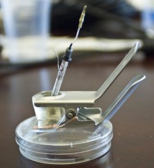 Fotoelektrohemijska solarna ćelija Na fotografiji pored prikazana je laboratorijska testirana verzija fotoelektrohemijske ćelije. U staklenoj posudi na dnu su samoobnavljajući molekuli koji su povezani na dve elektrode: platinumska (gola žičica) i srebrna (u staklenoj cevi) foto: Patrick Gillooly |