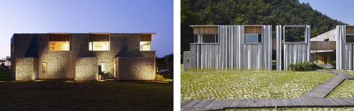 fasada od gabiona u večernjim satima (levo), fasada od betona livenog u tekstilnoj oplati (desno)
