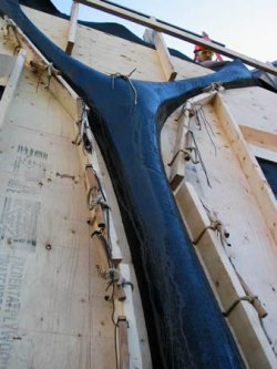 - kombinovana tekstilna oplata - jedna strana je ravna oplata (OSB, drvo, , metal, itd) a tekstil se ankeriše na tu površinu: ovakva oplata pogodna je npr. za izradu fasade jer je jedna strana (ka unutrašnjem delu zida) sasvim ravna, što može biti prednost i kod izrade zidova u enterijeru gde samo jedna strana treba da bude estetski privlačnija (npr. različiti holovi, ulazne partije, stepenište u zgradama i sl.)