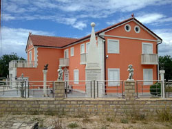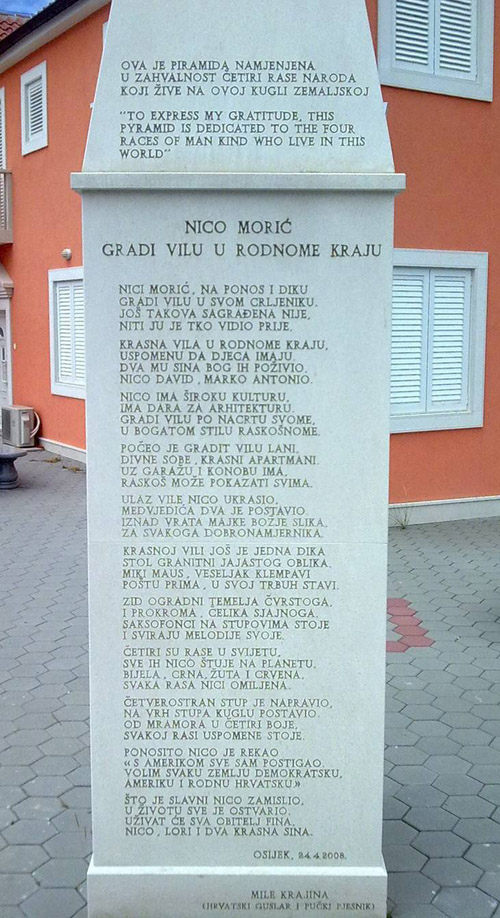 Kao što se na fotografijama vidi, osim karakterističnih medvedića na stubovima oko ulazne kapije i omanjeg obeliska u dvorištu kuće, na njoj nema ništa posebno zanimljivo u odnosu na primere koje možemo naći na interneru. Ali, kada se priđe bliže obelisku mogu se pročitati uklesani stihovi poeme koja koja objašnjava ko je, za koga, gde i zašto podigao ovu vilu. Uživajte...