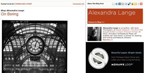 I ona sama počela je da piše blog od juna 2009. godine, kada se već osetio zastoj u poslu. Ona je to iskoristila da kritikuje i Nicolai Ourroussoff-a, arhitektonskog kritičara New York Times-a: