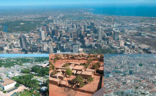 Kolaž 1 – Fotografije Melburna, Australija (vrh); Oklahoma, SAD (donja levo); Ouagadougou, Burkina Faso (dole sredina); Marselj, Francuska (donja desno) ilustruju primere varijacija materijala i urbane morfologije. Rezultira različitim, jedinstvenim prostornim i vremenskim obrascima urbanog zagrevanja. Izvor: Prisvojeno iz Potčera (Potchera O., 2006).
