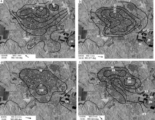 Kolaž 2 – Prostorna i vremenska dinamika urbanog zagrevanja: Ber Ševa, Izrael (Beer Sheva). Uticaj urbanog razvoja i meteoroloških uslova je evidentna. Gornja levo – zora zimi; gornja desna – zora leti; donja levo – podne leti; donja desno – podne zimi. Izvor: Prisvojeno iz Potčera (Potchera O., 2006).