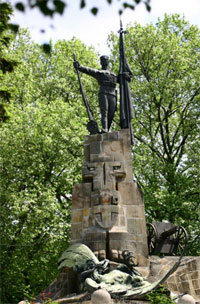 foto: kosturnica srpskih vojnika iz Prvog svetskog rata na Novom groblju u Beogradu. U podnožju spomenika, pod barjakom, leži austro-ugarski dvoglavi orao (fotografija preuzeta sa sajta JKP Beogradska groblja).