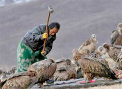 Pogrebnici ručno odvajaju meso od kostiju, a kosti usitnjavaju. Lešinari čekaju pripremljen obrok.