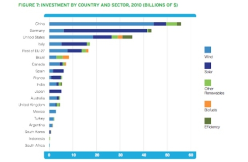 Prema izveštaju "Who's Winning the Clean Energy Race 2010" (Ko pobeđuje u trci ka obnovljivoj energiji), izdatog od strane "The Pew Charitable Trust", privatno investiranje u obnovljive izvore energije u Kini poraslo je u 2010. godini za neverovatnih 39% od predhodne godine. To predstavlja investicije u vrednosti od 54,4 milijardi američkih dolara. To je impresivna cifra, ali investicije u obnovljive izvore energije nisu ograničene samo na Kinu.