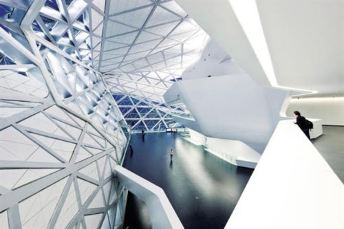 "Dve zgrade su otelotvorene u veštačkom predelu impregnirane sa programom koji prati prostor," objašnjava Patrik Šumaher (Patrik Schumacher), koji je, zajedno sa direktorom projekta Vudijem K.T. Jao-om (Woody K.T. Yao), projektovao objekte uz Zahu Hadid.