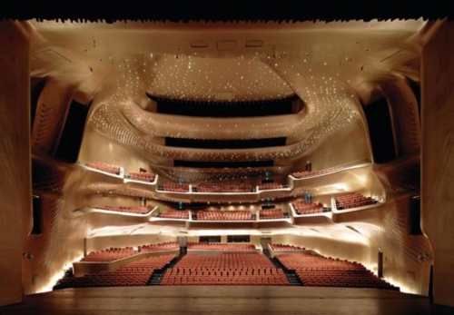 Razuzdano stepenište i oblikovane terase foajea u glavnom obimu predaju prostor auditorijumu, dok zakrivljeni balkoni - dizajnirani tako da fragmentuju zvuk akustično i da obezbede podjednaku liniju viđenja svakom gledaocu - izranjaju glatko iz zidova, formirajući kontinuiranu površinu koju Šumaher naziva "balansiranom asimetrijom" auditrijuma.